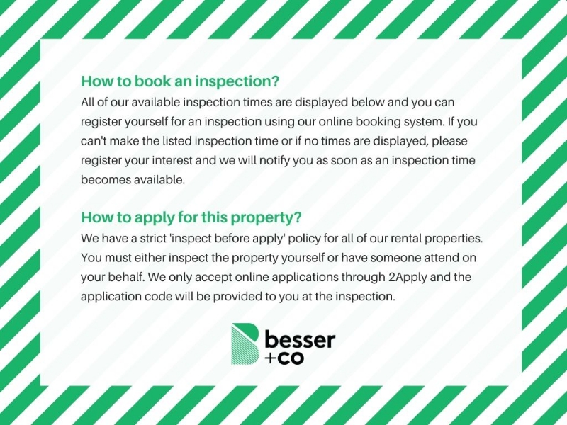 Feel on top of the world in this light filled, top floor apartment. Offering an expansive open plan living room, serviced by a wrap around balcony with leafy district and city views, ideal for entertaining. Cook up a storm in the modern kitchen, with ample storage. A comfortable bedroom features built in robes and the sleek, fresh bathroom provides walk in shower and laundry taps/trough. The addition of split system heating/cooling, secure intercom entry and off street parking for one car complete this package. Positioned in between Vic Uni and Footscray Hospitals, this superb apartment offers easy access to everyday life. Just minutes to central Footscray with a plethora of shops, restaurants and cafes, and transport options at your door with Geelong or Ballarat Road. BOOKING AN INSPECTION All of our available inspection times are displayed below and you can register yourself for an inspection using our online booking system. If you can't make the listed inspection time or if no times are displayed, please register your interest and we will notify you as soon as an inspection time becomes available. APPLYING FOR THIS PROPERTY We have a strict 'inspect before apply' policy for all our rental properties. You must either inspect the property yourself or have someone attend on your behalf. We only accept online applications through 2Apply and the application code will be provided to you at the inspection.