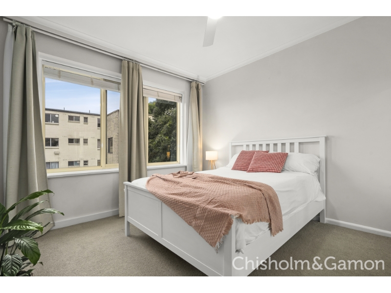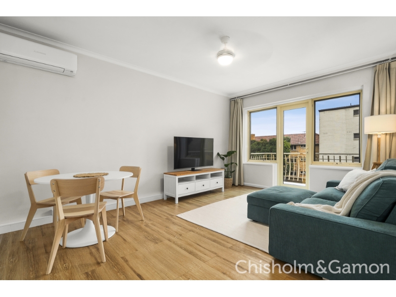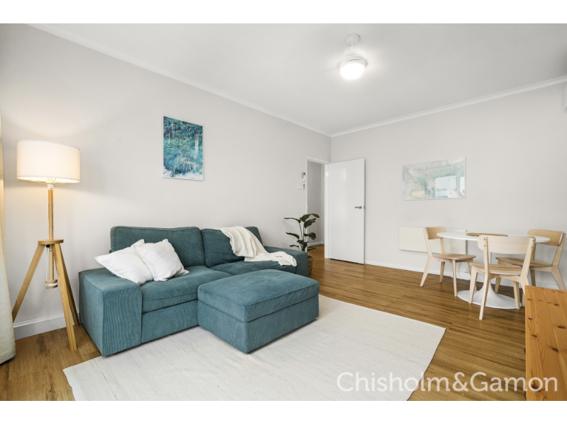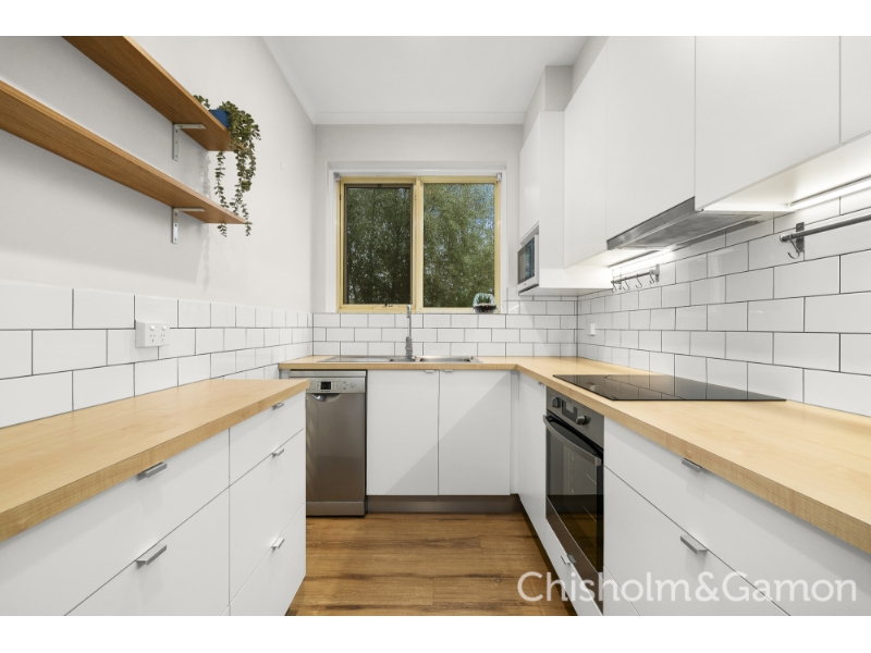 At the very rear, at the very top, this whisper-quiet apartment offers light-filled stylishly refreshed accommodation ideally suited to a busy lifestyle. Beyond secure intercom entry, the easy care lock & leave home is made all the more peaceful thanks to the quality inclusion of double glazing throughout the apartment. Introduced by a distinct entrance hall flowing past two spacious double bedrooms - both with robes – the true highlight is the open plan living and dining zone that is oriented to soak up northern sunshine and spills out to a neat alfresco balcony where you can enjoy the summer sunset. All-electric stainless steel appliances including a Bosch dishwasher star in the smart kitchen, which features a subway-tiled splash back and leafy outlooks, while the sparkling bathroom boasts the same aesthetic and incorporates a practical laundry bench and space for a washing machine. Multiple ceiling fans and panel heaters boosted by a split system ensure absolute year-round comfort while a conveniently located undercover parking space. Close to the tram & Ripponlea station and a walk to Tennyson Street village cafes and shops, this prime locale is also close to parks & recreation facilities and a short stroll Elwood beach.